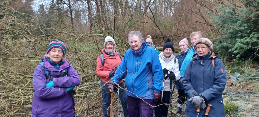 But back to the ramble. Nothing ever goes as expected, does it? Unknown to us, a tree had fallen near the end of the route since we had reccied it, completely blocking our way. However, your fellow u3a members are a plucky lot! – and perhaps motivated by the idea of lunch, each of us soon found a way through, either scrambling around, over or between the branches of the unfortunate tree. The photo shows the stalwarts posing cheerfully in front of their conquest!