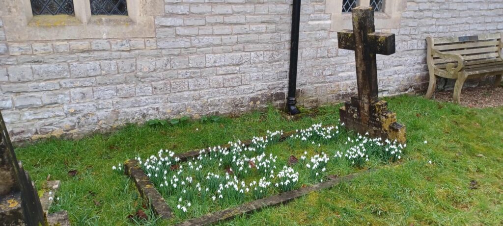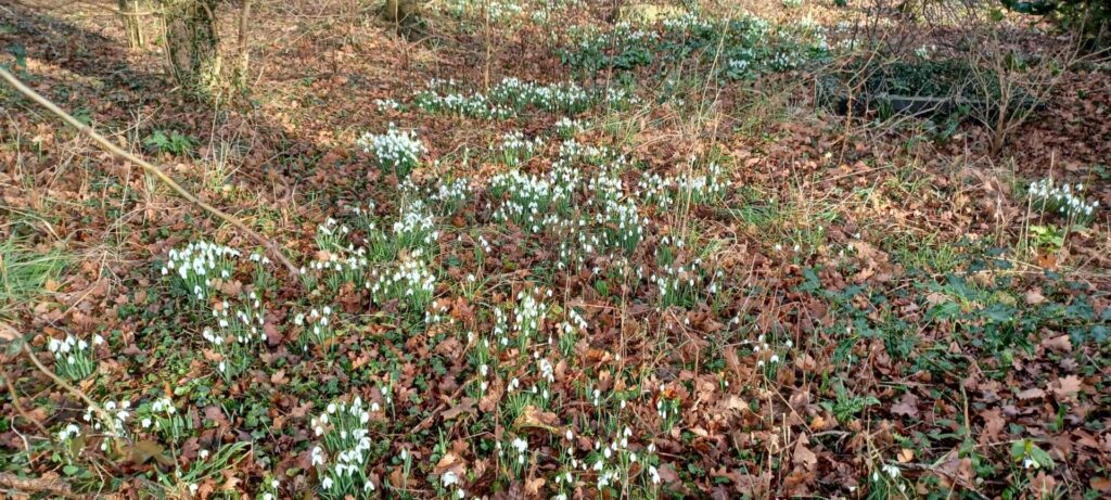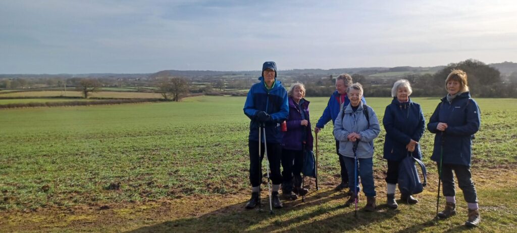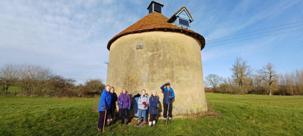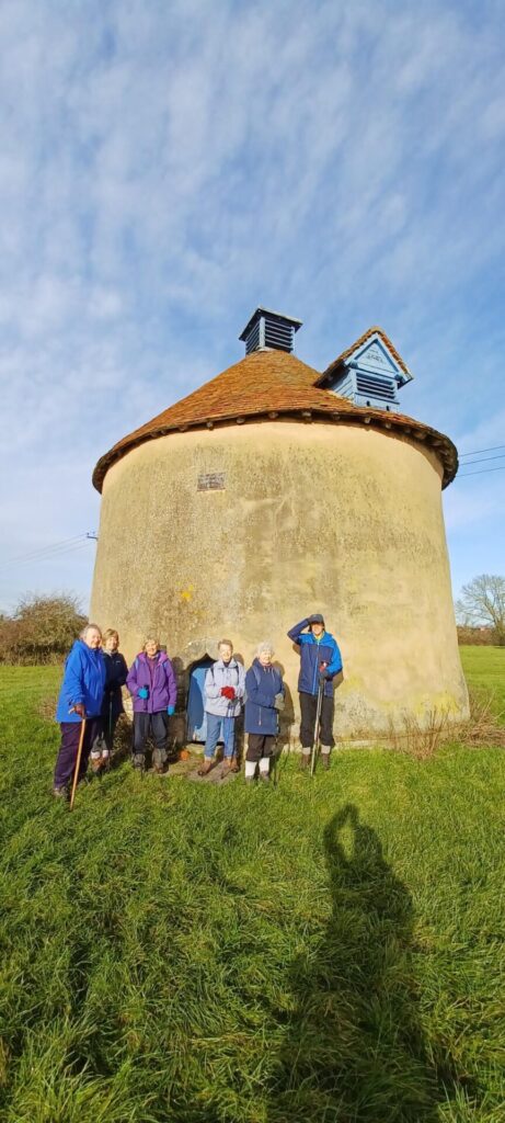 Though the route was essentially flat, we nevertheless found ourselves from time to time on ridges from which we enjoyed wide and uninterrupted views of the landscape around Alcester. We saw much evidence of the recent rainfall – the River Alne looking rather high, ponds threatening their surrounding banks, and I have to admit that the ground underneath our feet was at times, rather squishy!. It was so uplifting to experience the signs of the seasons starting to turn. We found snowdrops to be much in evidence and encountered a cheerful display of bright yellow aconites. We were treated to the sounds and sights of buzzards wheeling above us in the sky and even, giving me great excitement, the first skylarks! Our route took us past Kinwarton Dovecote where I took the first group photo. The circular 14th-century Dovecote is managed by the National Trust. It is rarely open to human visitors so in being able to peek inside, we were quite fortunate, more fortunate than avian visitors whose entry points are now permanently sealed.